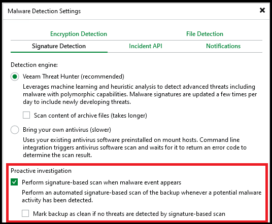With Veeam Backup & Replication v13, administrators can now proactively validate such events by automatically triggering a signature-based scan when a malware event appears. This feature, also known as Veeam Threat Hunter automated scanning, can be enabled in the Malware Detection Settings under Signature Detection, using either Veeam Threat Hunter or a bring-your-own antivirus solution.